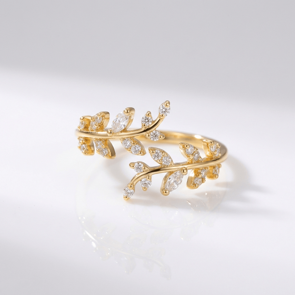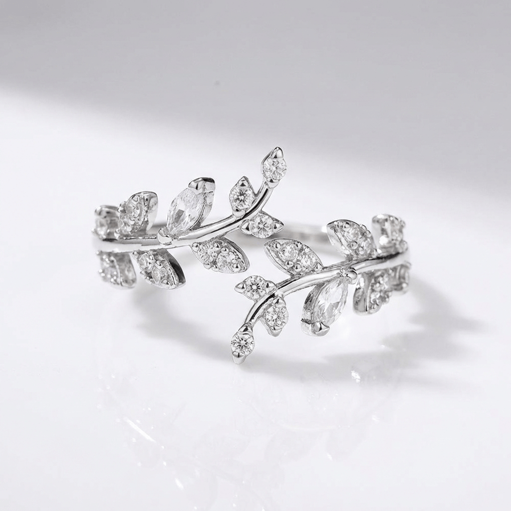 CRYSTAL LEAF VINE SILVER RING - (ADJUSTABLE)